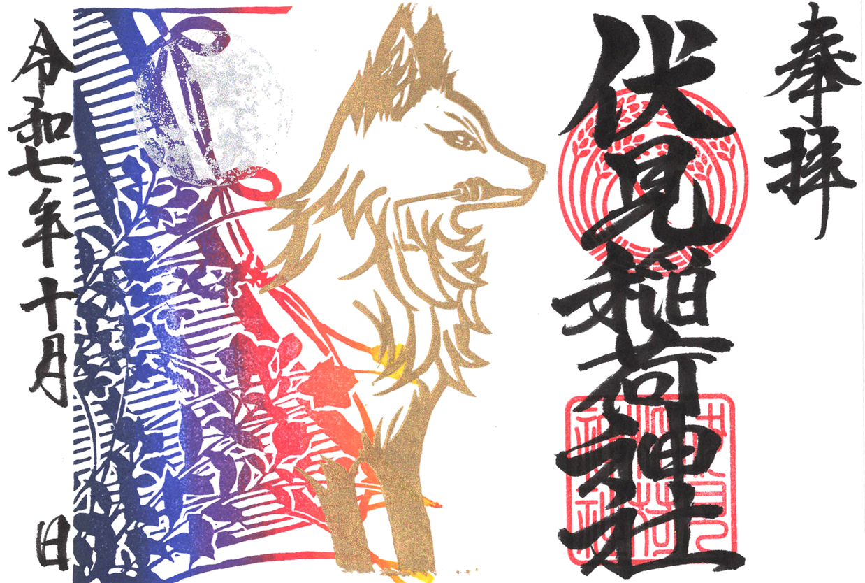 風に揺れる御簾と月と神狐を描いた伏見稲荷神社10月限定の御朱印です。 (御朱印の浄書にお時間をいただく場合もございます。混み合っている場合、お預かり の対応をお願いすることもございます。)