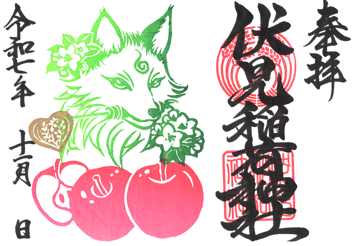 旬を迎えた林檎と神狐の伏見稲荷神社11月限定の御朱印です。 (御朱印の浄書にお時間をいただく場合もございます。混み合っている場合、お預かり の対応をお願いすることもございます。)