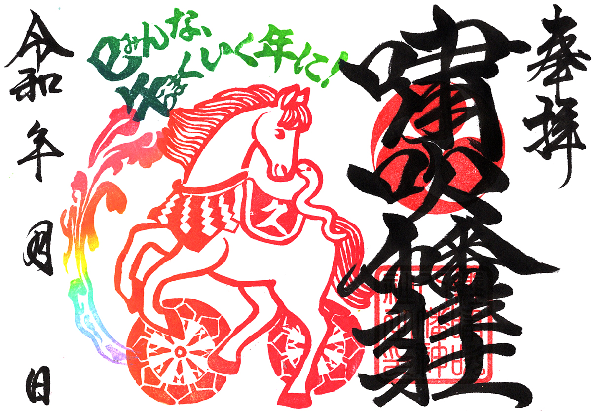 「令和7年巳年」と「令和8年午年」とを結ぶこの時期に、新しく迎える年も「みんなうまくいく」良い年になりますように祈念した、12月限定の御朱印です。馬の鞍には「久」の文字で「うまく」を表現し、足元の紋様の「源氏車」は「永遠続く幸せ」を表しております。