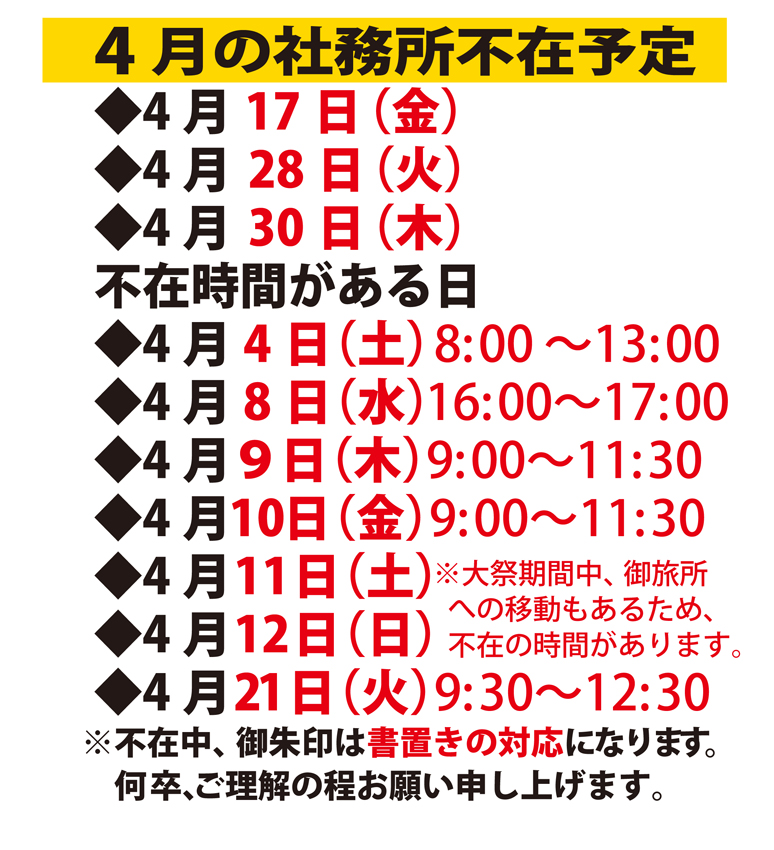 不在の時間があります。 ◆4月21日(火)9:30〜12:30